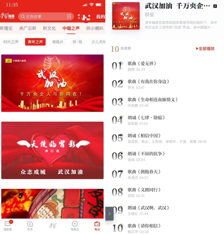 为了号召广大央企人积极投身这场“抗疫”狙击战,记录并抒怀央企平凡英雄们的心声,国务院国资委宣传局组织了本次“中央企业战疫歌曲征集活动”。中国华录集团旗下中国唱片集团积极承担文化央企使命,从各中央企业报送的231首作品中精选编辑,策划制作了《武汉加油,千万央企人与你同在!》央企抗疫作品精选集,并在第一时间上线中宣部学习强国平台。