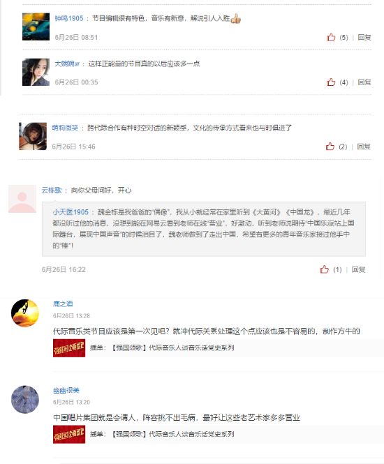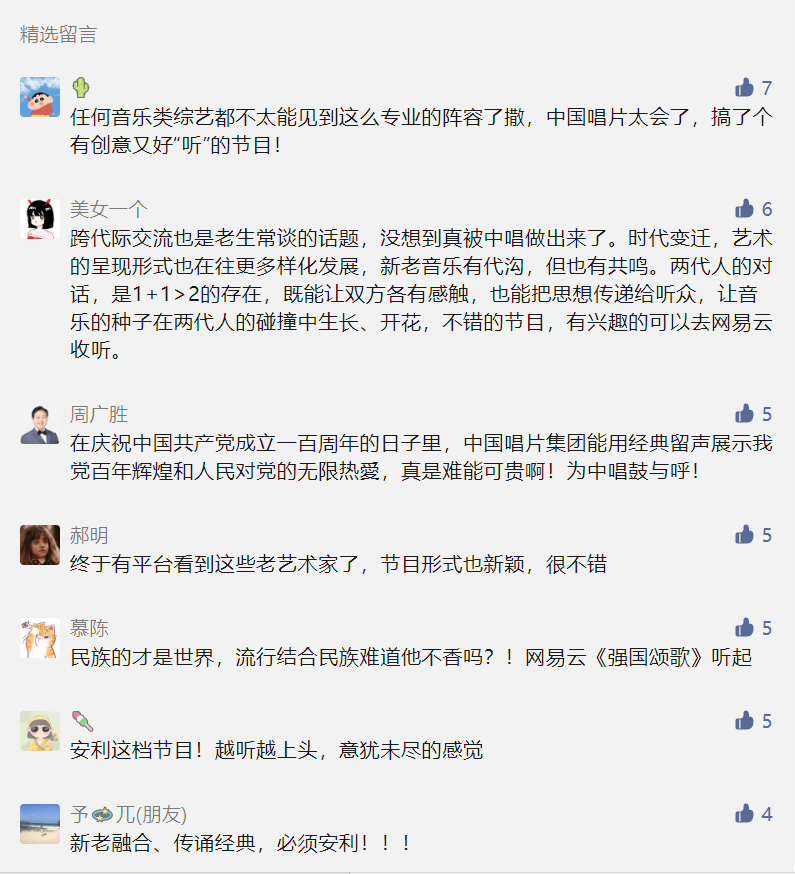 通过留言评论区的反馈可以看出,众多听众用户除了被经典的音乐作品和老艺术家的精湛艺术水准所折服外,特别对中国唱片推出的老艺术家、新生代音乐人代际交流这种创新的节目模式表达出了喜爱之情。节目中老艺术家脱口而出的一些“金句”,诸如:中国声音,中国乐派,让中国老百姓喜欢。我坚守的理念是民族的、时尚的、艺术的、国际的。踏踏实实沉在人民当中才能出精品等这样的语句,也让听众产生了极大共鸣。