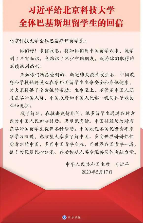 2020年5月17日,北京科技大学全体巴基斯坦留学生收到了习近平总书记的重要回信。习总书记在回信中对北科中外学子患难与共的真情表示欣慰,并对广大留学生及中国青年提出殷切期盼,希望各国青年携手为促进民心相通、推动构建人类命运共同体贡献力量。
