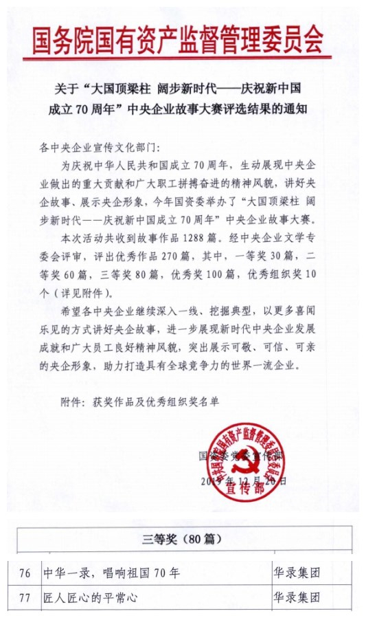 近日,由国务院国资委举办的“大国顶梁柱 阔步新时代,庆祝新中国成立70周年”中央企业故事大赛评选结果揭晓。由集团公司选送的《中华一录 唱响祖国“70”年》和《匠人匠心的平常心》获本次故事大赛三等奖。《中华一录 唱响祖国“70”年》一文讲述了中国华录用音乐讲好中国故事、做好民族文化传承、传播优秀中国文化的情怀;《匠人匠心的平常心》记录了技能大师马瑾超三十年兢兢业业,用心做好一件事的工匠精神。