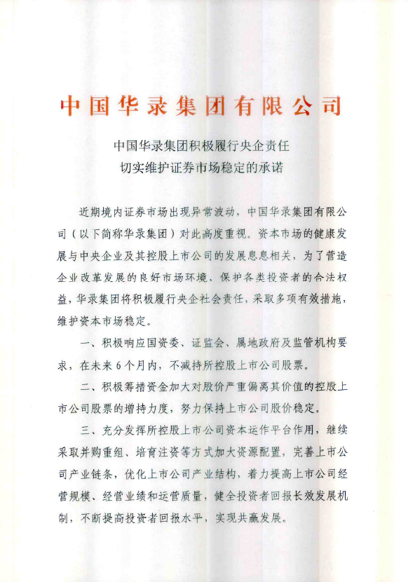 中国华录集团积极履行央企责任切实维护证券市场稳定的承诺