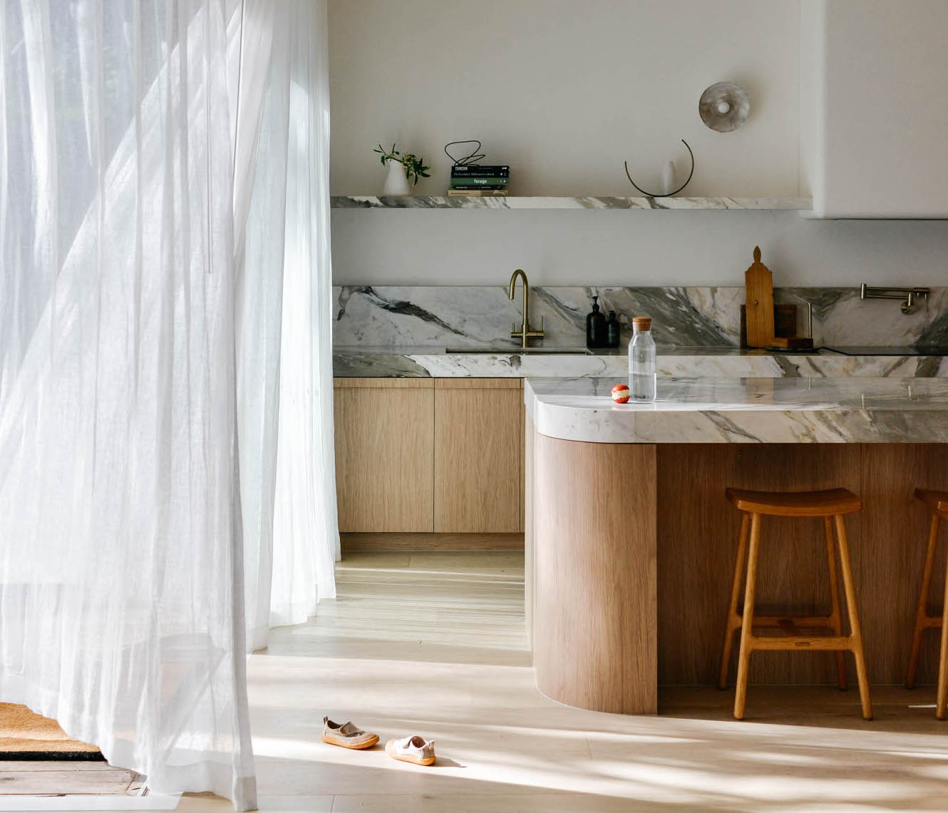 Less than 100 metres from the Mount Martha shoreline, this beach house is a slice of the Mediterranean on the peninsula – you’ll want to fire up the group chat for this one. There’s a circular heated pool, space for eight guests, a marble-splashed kitchen, a deck that looks out over Red Hill, Arthurs Seat and Port Phillip Bay, and a day spa-inspired ensuite – all pink travertine and stone finishings – worth fighting over. Sleeps eight / from $1220 a night / two-night minimum / book here.